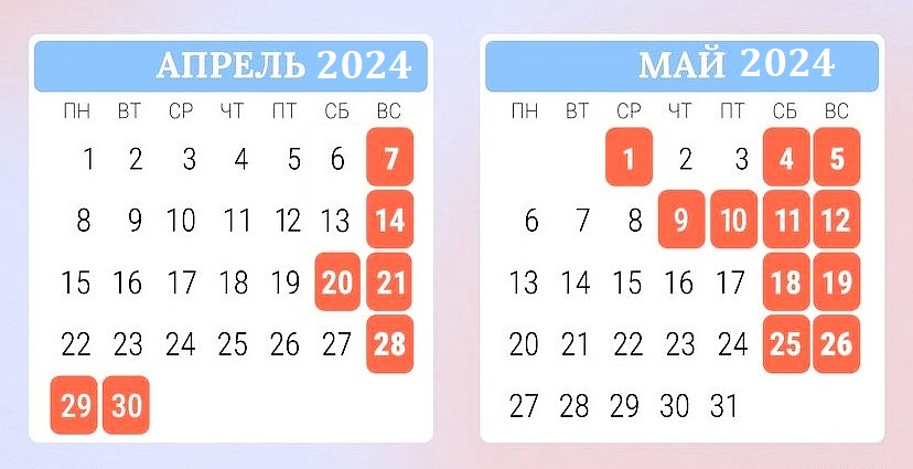 28, 29, 30 апреля + 1, 4, 5, 9, 10, 11, 12 мая = выходные дни