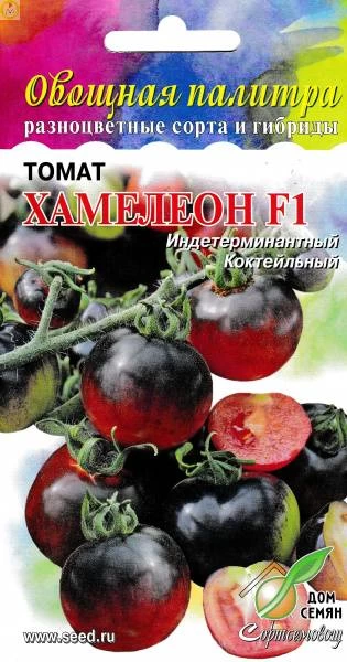 Раннеспелый (95-100 дней от всходов до начала плодоношения) гибрид для пленочных теплиц. Растение индетерминантное с укороченными междоузлиями, высотой 1,5-2,0 м. Кисть простая, состоит из 7-10 плодов. Плоды округлые, гладкие, глянцевые, массой 40-50 г. Томат Хамелеон F1 от Сортсемовощ в технической спелости темно-зеленые, в биологической темно-фиолетовые с кремовыми вкраплениями. Мякоть вишнёво-красного цвета, сладкая и ароматная. Ценность гибрида: урожайность, декоративность, уникальный вкус плодов. Антоцианы, дающие темную (коричневую, фиолетовую) окраску плодам, полезны для иммунитета и для профилактики вирусных и простудных заболеваний. Предназначен для свежего потребления и цельноплодного консервирования.