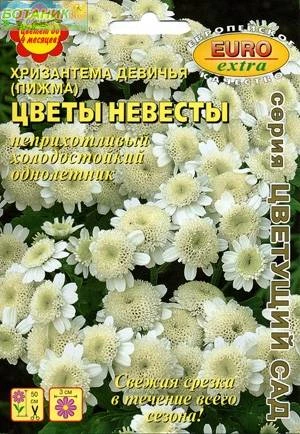 Однолетник. Высота 50 см. Куст компактный, сильноветвистый. Листья перисто-рассеченные или глубоко разрезанные, мягко опушенные, светло-желто-зеленые. Соцветия корзинки диаметром 3 см, махровые, собраны в верхушечные соцветия. Многочисленные цветки Хризантемы Цветы невесты девичья от Аэлита белоснежного цвета, порадуют Вас своим обильным и продолжительным цветением с июня по сентябрь. Растения красиво смотрятся в групповых посадках, в цветниках и на газонах, очень хороши в бордюрах, уличных вазонах, балконных ящиках. Срезанные соцветия незаменимы в букетах и долго сохраняют свежесть. Также хризантему «Цветы невесты» можно выращивать в комнатных условиях. Предпочитает солнечные или полутенистые участки с богатой, гумусно-песчаной, известкованной, увлажненной и хорошо дренированной почвой. Переносит кратковременные заморозки.