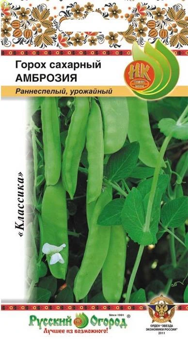 Скороспелый(от всходов до начала сбора плодов 55-56 дней) сорт. Стенки бобов толстые, мясистые, очень сладкие, без наличия жестких тканей и пергаментного слоя. Высота стебля 60-70 см (выращивается без опор). В каждом бобе завязывается 7-8 горошин. В пищу используется молодой боб-лопатка с зачаточными семенами. Вкусовые качества отличные. Горох Амброзия от Русский огород-НК рекомендуется для потребления в свежем виде, замораживания, консервирования и в домашней кулинарии.