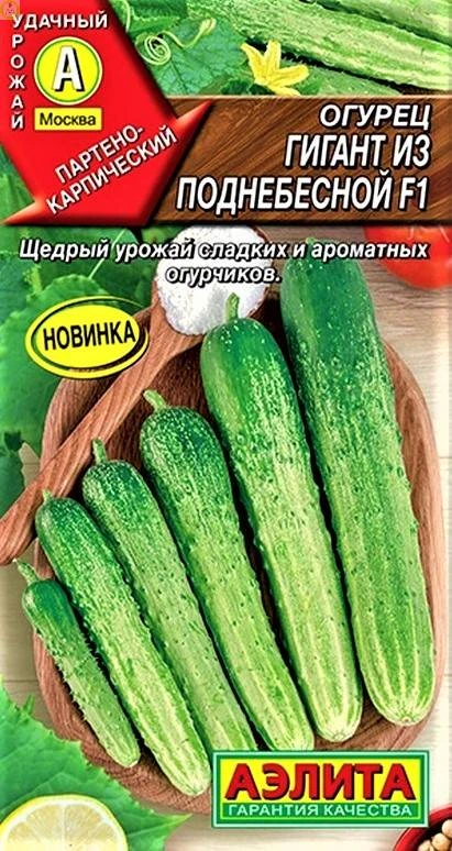 Неприхотливый партенокарпический гибрид. Ценится за щедрый урожай, хорошую устойчивость к погодным условиям и высокую толерантность к самым распространенным болезням культуры. Гибрид раннего срока созревания. Рекомендуется для защищенного грунта. Огурцы Гигант из поднебесной F1 от Аэлита с яркой кожицей, длиной около 35 см, с крупными редкими бугорками. Мякоть отличного сладкого вкуса, ароматная, не горчит. Растения высокорослые, с укороченными междоузлиями. С отличной способностью к завязи плодов. Наилучшим образом подходит для летних салатов.