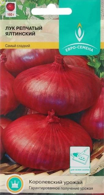 Замечательный высокоурожайный сорт салатного назначения. Несмотря на южное происхождение,относится к сортам нейтрального дня, поэтому может возделываться и в центре России. Период от всходов до уборки составляет 138-150 дней. Образует плоскую луковицу фиолетовой окраски, массой до 160 г. Вкус имеет сладкий, со слабоострым привкусом. Хранится до 4 месяцев. Лук репчатый Ялтинский от Евро-семена возделывается из чернушки через рассаду, которую выращивают 40-60 дней.