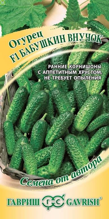 Скороспелый, партенокарпический гибрид. От полных всходов до созревания 43-45 дней. Растение сильнорослое с ограниченным ростом боковых побегов, женского типа цветения и пучковой завязью. Ценность сорта: отличается повышенной урожайностью и долгим периодом плодоношения. Устойчив к корневым гнилям, настоящей и ложной мучнистой росе, оливковой пятнистости, кладоспориозу. Зеленец цилиндрический, бугорчатый, зеленого цвета, белошипый. Длинна плода 10-12 см, масса 85-115 г. Вкус сладкий без горечи. Огурец Бабушкин внучок от Гавриш рекомендуется использовать в свежем виде, засолке и консервировании. Рекомендован для выращивания под временными пленочными укрытиями и стеклянных теплицах, в открытом грунте. Прямой посев производится в прогретую почву, обычно в конце мая начале июня, глубина заделки семян не более 1,5-2 см. Плотность посадки в открытом грунте 4-5 растений, в теплицах 2-3 растения на 1 кв.м. Возраст рассыды при рассадном способе выращивания, перед посадкой должен составлять 20-30 дней.