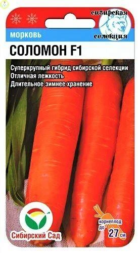 Среднеспелый(120-140 дней от посева до сбора) гибрид. Корнеплоды цилиндрические, с гладкой поверхностью, ярко-оранжевой окраски. Длина корнеплода 20-25 см. Используется для употребления в свежем виде и для переработки. Рекомендован для длительного хранения. Посев семян Моркови Соломон F1 от Сибирский Сад в грунт производят в конце апреля - начале мая на глубину 1 см, расстояние между рядками 15 см. Подросшие всходы прореживают, оставляя между растениями по 5-7 см. Предпочитает нейтральную хорошо дренированную почву.