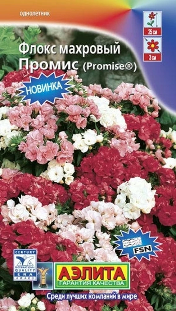 Однолетник. Награжден международной организацией производителей цветочных семян FLEUROSELECT. Высота растения 25 см. Диаметр цветка 3 см. Куст компактный, густо ветвящийся, стабильно сохраняет в течение сезона выравненностъ и однородность. Цветки махровые, ароматные, собраны в плотные, щитковидные соцветия. Цветение суперобильное, с июня по октябрь. Флокс Промис махровый смесь от Аэлита светолюбивые, лучше растут на легких плодородных почвах. Используется для срезки, в цветниках, на клумбах, рабатках, для создания красивых бордюров. Посев в марте на рассаду. После появления двух настоящих листьев сеянцы пикируют. В открытый грунт рассаду высаживают с середины мая, на расстоянии 20 см. При продолжительной засухе требуется полив, застой воды переносит плохо, подкормки проводить 3-4 раза за сезон.
